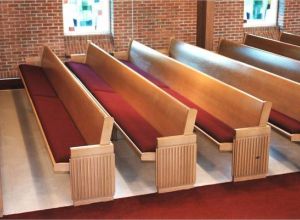 Pew Back cushions with plywood base can be added for additional comfort and to cover up cracks and splinters and deteriorating stain finishes. The polyurethane foam is 3/4" to 1" thick.
