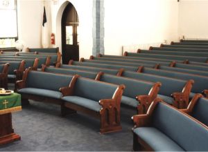 To add the ultimate in comfort while maintaining the stately integrity of older pews, custom upholstering could be your best solution. Upholstering seats only or upholstering seats and backs delivers a more comfortable seating area. Their tailored professional styling is an appealing alternative to worn, cracked, or splintered pews and saves on the cost of refinishing. 2” high density polyurethane foam is added to the seats. 3” foam can be used to give additional comfort. For the backs 1” medium density polyurethane foam is used to improve your pew comfort and cover up the old wood finish. Custom installation is performed on site with the pews in place by our professional installers.